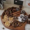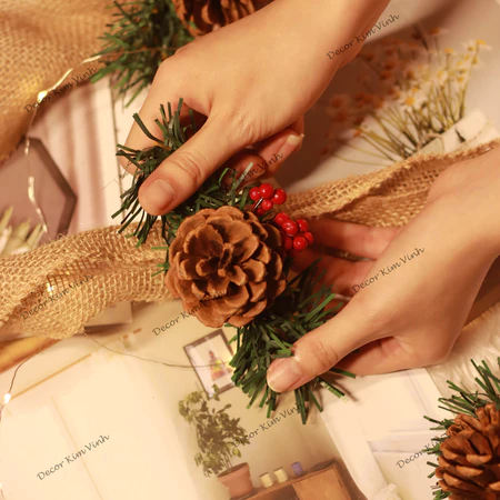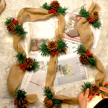 + Chất liệu: Chùm dây vải bố. Phụ kiện trái thông khô, chùm lá giả PVC, quả đỏ xốp mọng,..